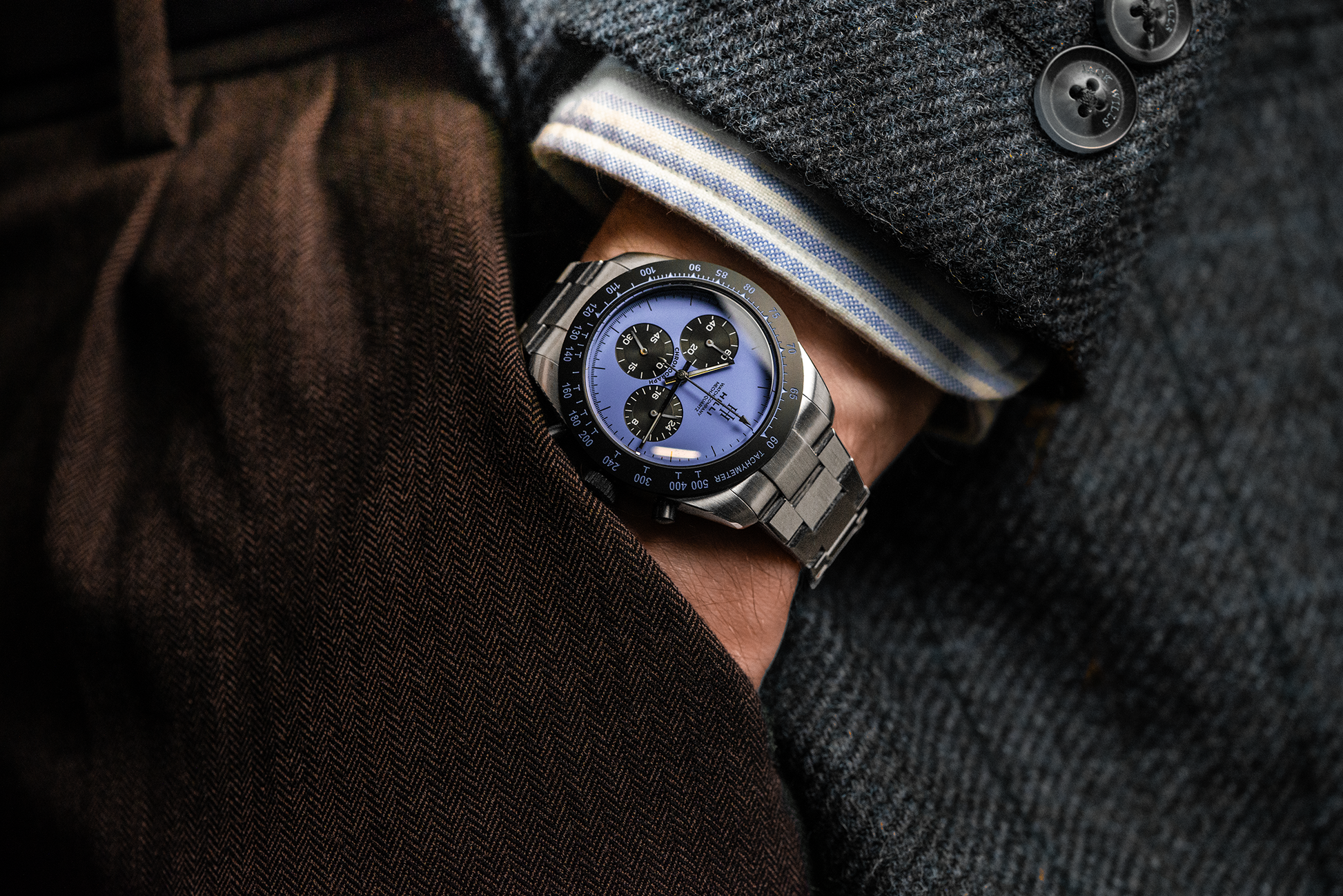 Finished in black PVD to reinforce the sport aesthetic and enhance durability. The crown features a ridged profile for easy grip, while the pushers are radially brushed for a refined, functional detail rarely seen outside custom builds.