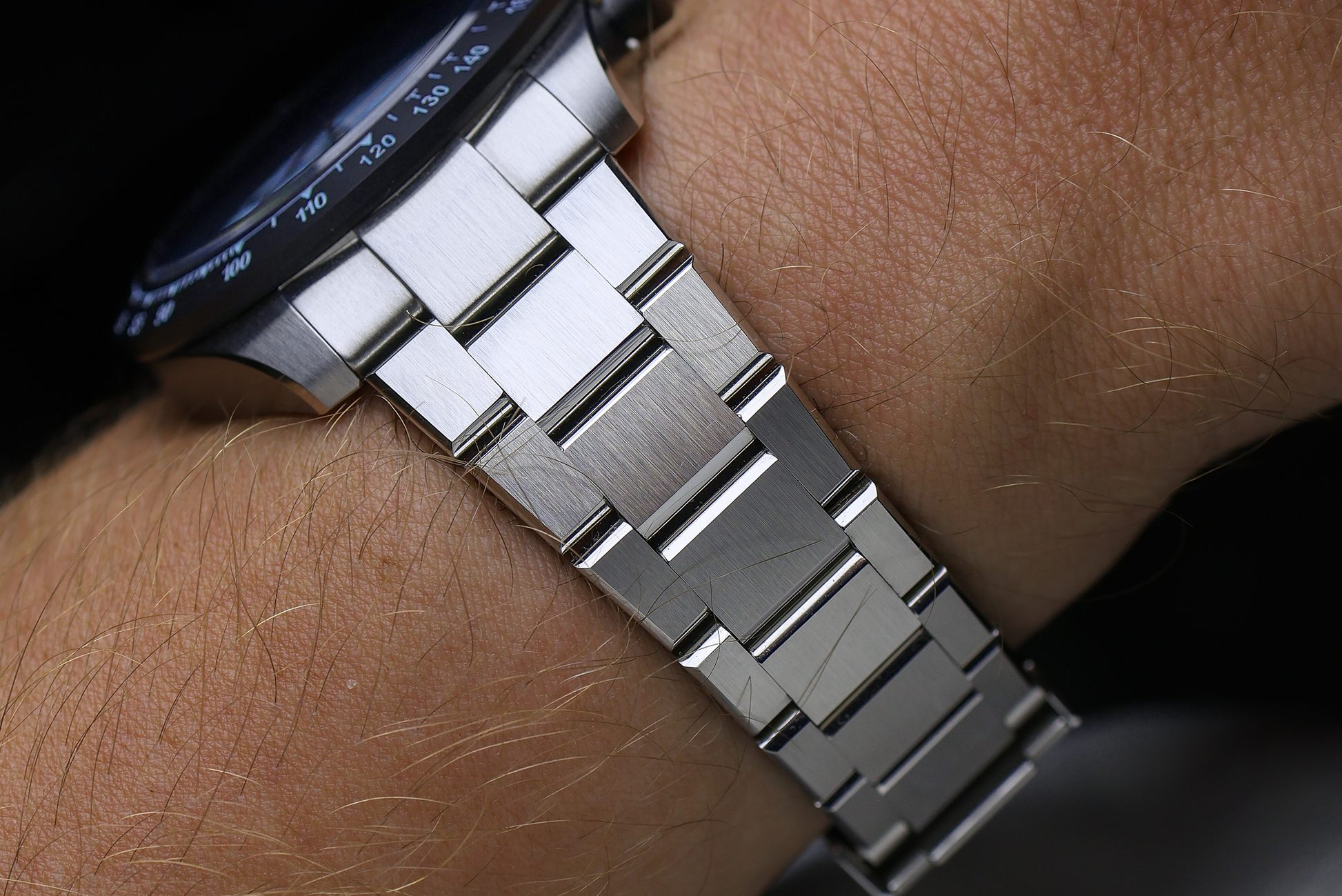 A solid stainless-steel bracelet with flat, articulated links for balanced weight, comfort, and a precise, modern silhouette. Each link is brushed to match the watch’s matte aesthetic, with polished bevelled edges that catch the light subtly without breaking the harmony of the design.